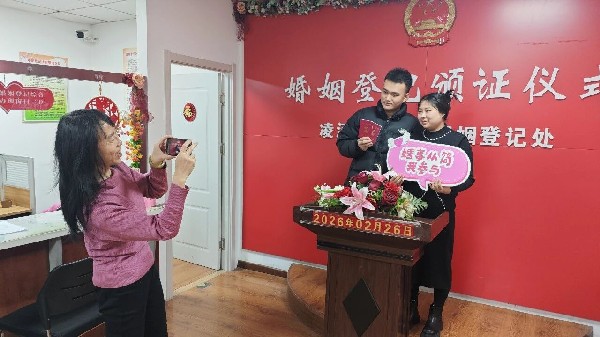 “嗯,正月初十寓意着十全十美嘛。我是河北的,爱人是锦州的,我们在网上预约后过来办理,非常快。”“全国通办后,整体流程体验怎么样?”“体验非常好,大概五六分钟就领到证了。”简短的对话,句句透着甜蜜与满意,用心贴心的服务,让幸福真实可感。